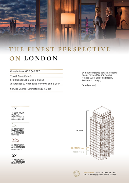 Q INVESTMENTS INTERNATIONAL LTD presents: Looking for a three-bedroom apartment in Westminster with skyline views, concierge service, and private parking? This rare residence offers boutique living in one of London’s most iconic riverside locations—just moments from Big Ben, the River Thames, and the South Bank.